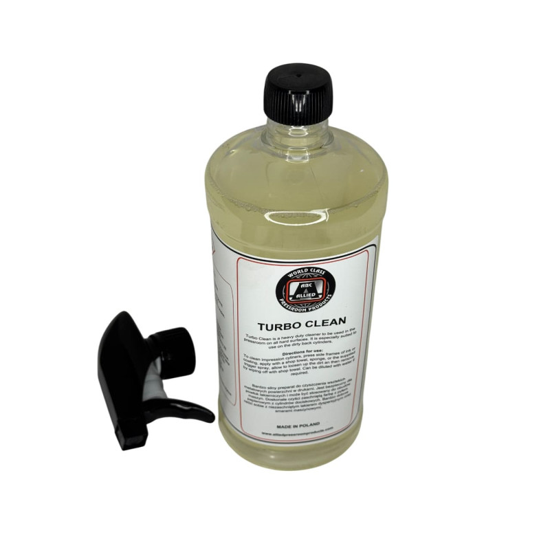 Turbo Clean – це сильний засіб для очищення металевих поверхонь у друкарні. Безпечний для лакованих поверхонь і може використовуватись на корпусі машини. Прекрасно чистить забруднення фарби з паперовим пилом із циліндрів. Добре справляється з незасохлим дисперсійним лаком та машинними забрудненнями.
