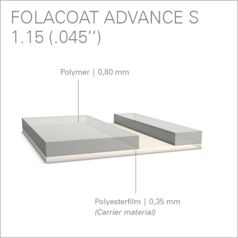 Вдосконалена лакувальна пластина Folacoat Advance S має м'який полімерний шар і підходить для використання з дисперсійними та УФ-покриттями. Рівномірний профіль товщини пластини забезпечує відмінне перенесення лаку навіть за найвищих швидкостей друку. Як основа використовується одношарова поліестрова плівка, що забезпечує необхідну стабільність. Folacoat Advance відмінно показує себе на невеликих та середніх накладах.